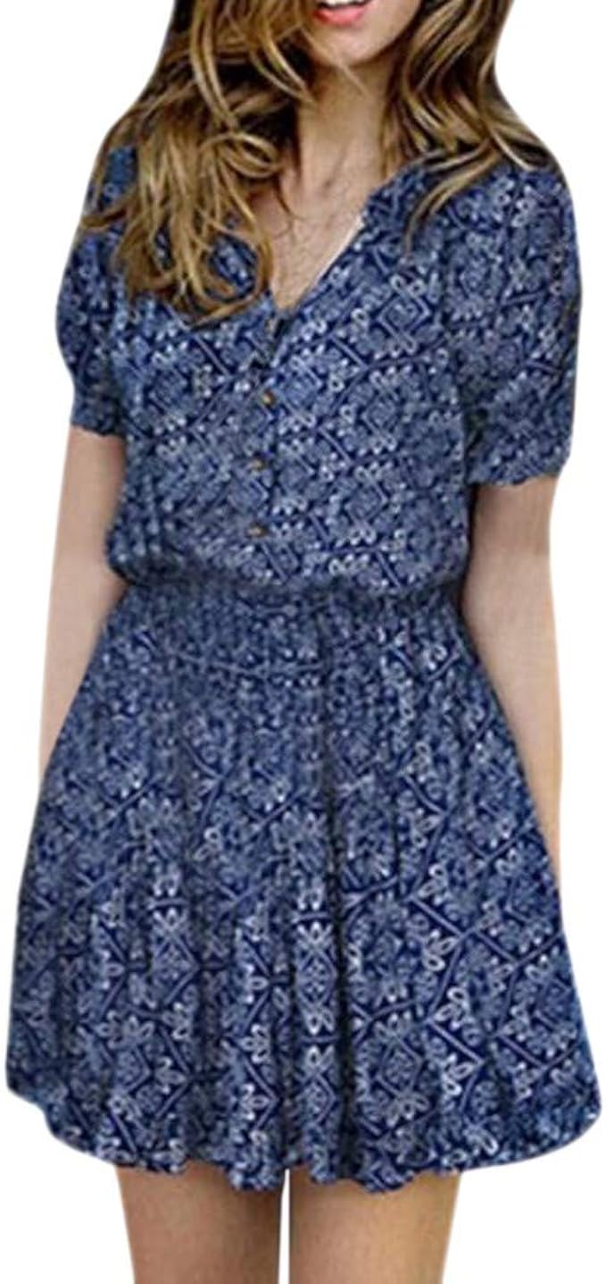 Imjono Frauen Summer Kleider Jubilaumsfeier 2019 Damen Sommer Blumendruck V Ausschnitt Lassige Kurzarm Minikleid Amazon De Bekleidung