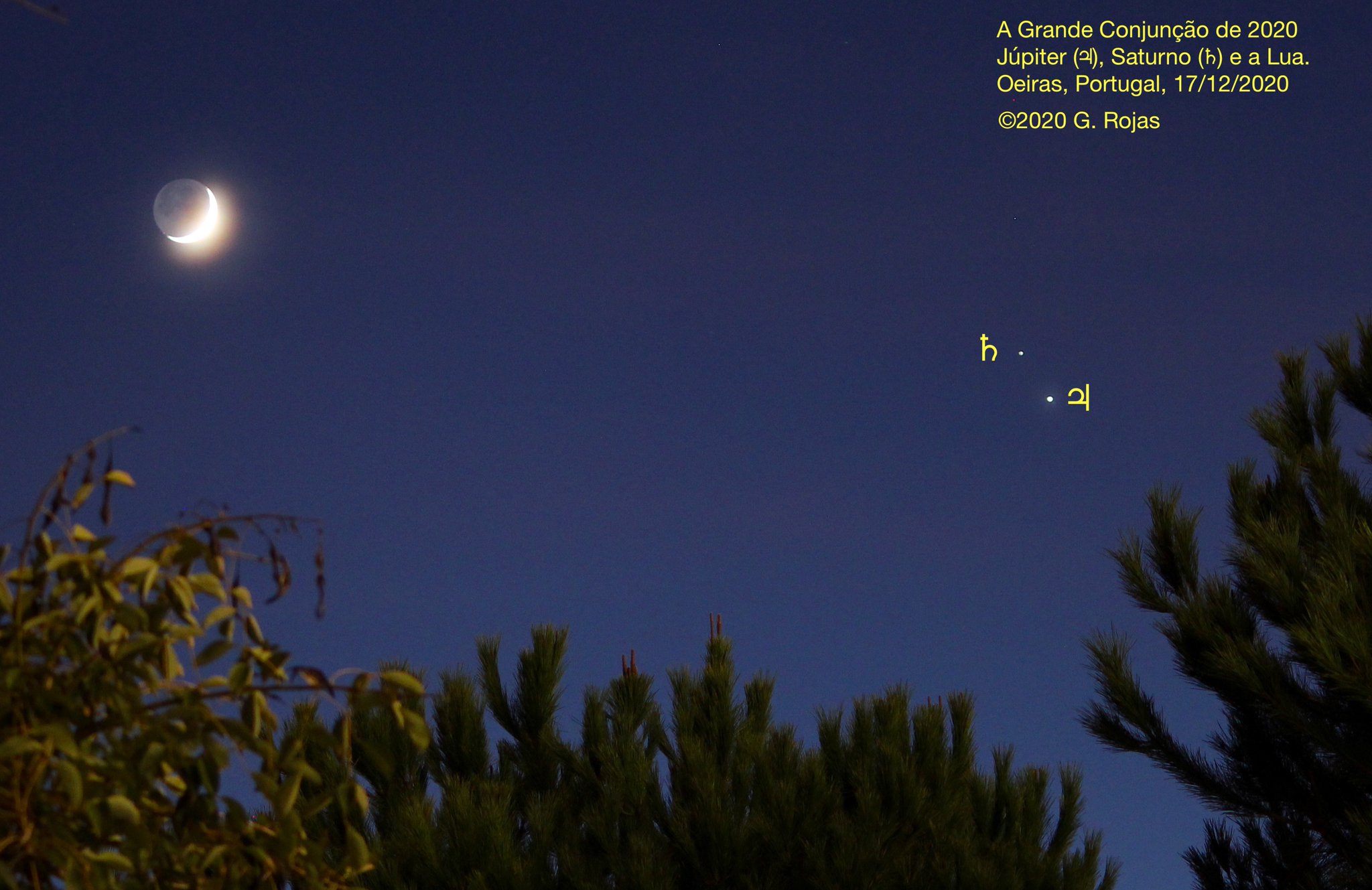 Gustavo Rojas on Twitter: "Hoje teve encontro de gigantes de novo! Júpiter e Saturno cada vez mais próximos, com uma palinha da Lua crescente. Agora é aguardar a aproximação histórica na próxima